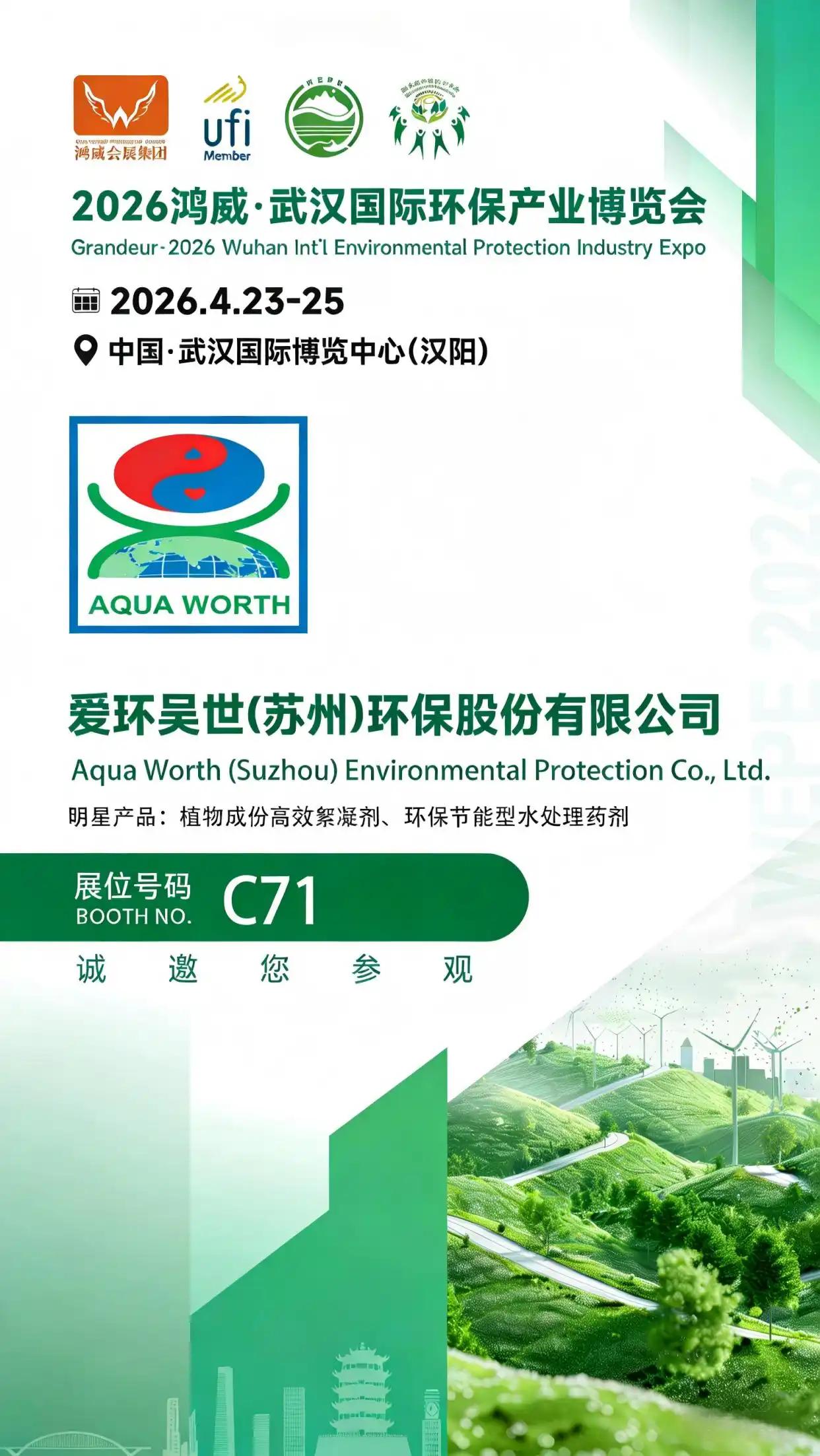 抢抓华中环保产业发展机遇,践行绿色低碳发展使命。2026年4月23日-25日,2026鸿威·武汉国际环保产业博览会(WEPE 2026)将在武汉国际博览中心(汉阳)盛大启幕。作为国内水处理及环保治理领域的标杆企业,爱环吴世(苏州)环保股份有限公司再度受邀参展,携核心环保技术、全系列水处理药剂及成套治理设备重磅亮相,展位号C71,与行业同仁共探生态治理新路径,共筑华中绿色发展新高地。